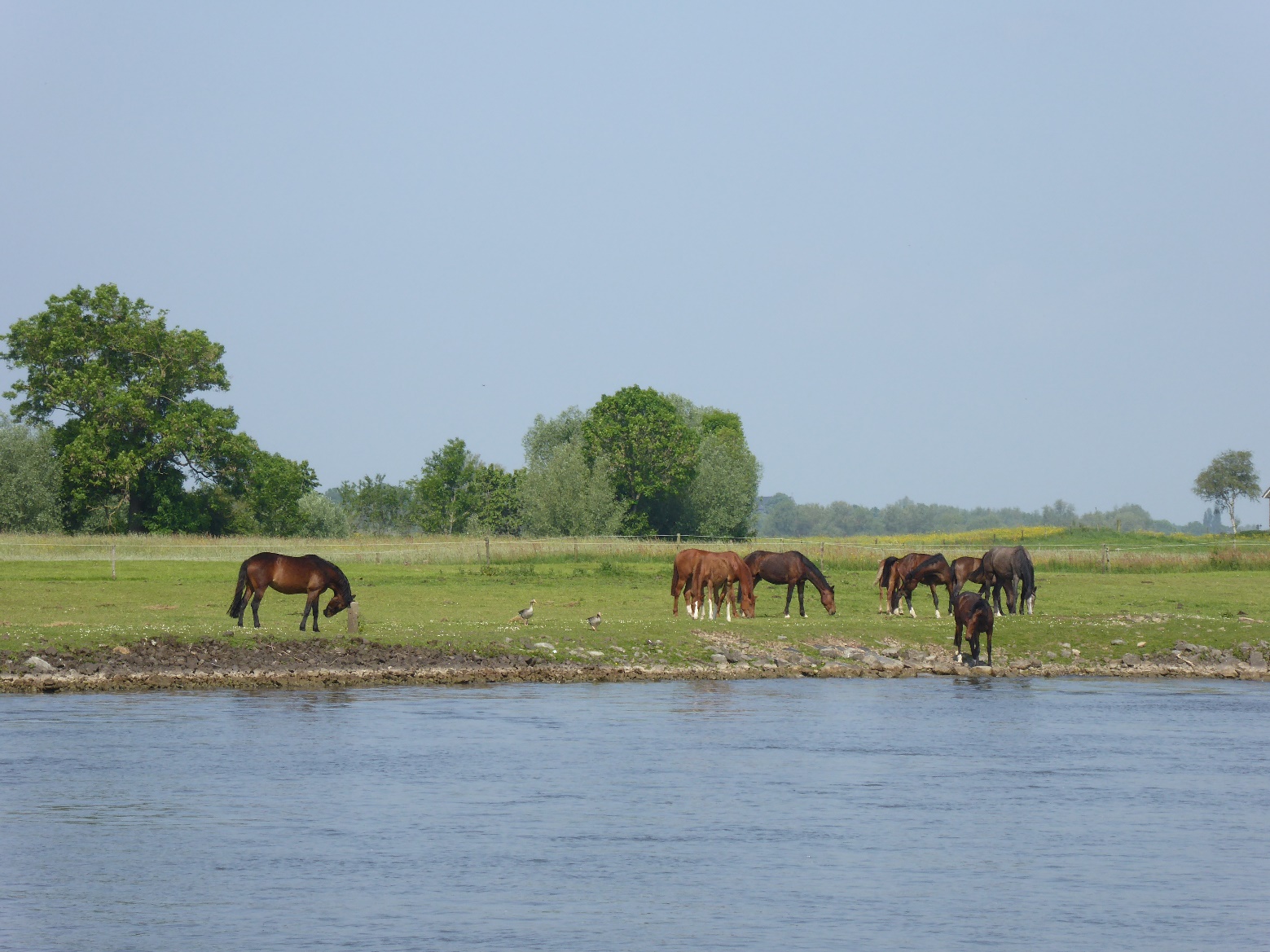 Die Kühe am Ufer sind alle noch müde. Es sind auch Lakenkühe dabei, die wir früher im richtigen Holland gesehen haben.