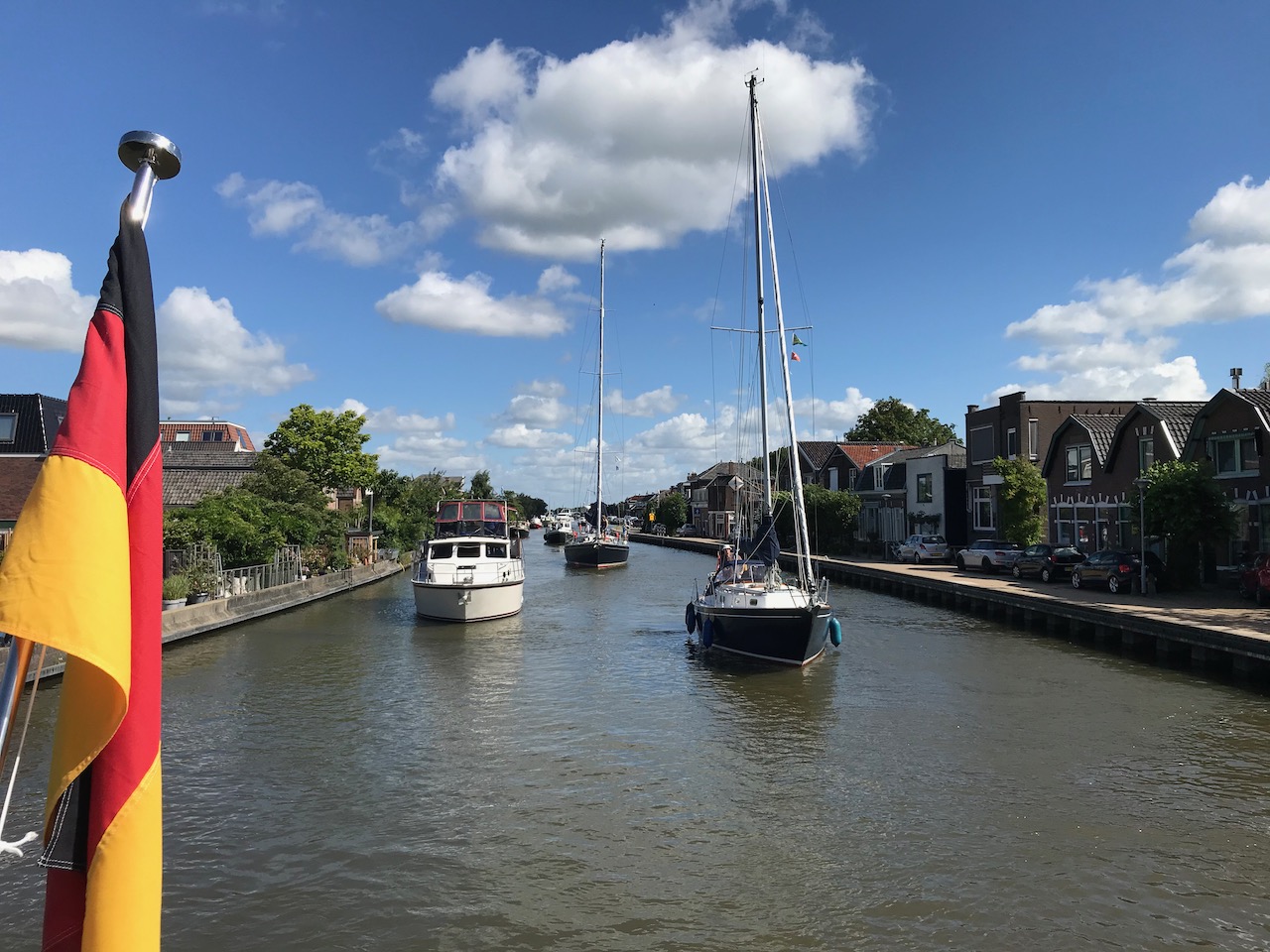 Um 13:20 sind wir am Gouden Ham, wo wir im letzten Jahr weit hinten durch „in der Pampa“ am Ufer gelegen haben. Diesmal beschließen wir angesichts des windigen und regnerischen Wetters direkt vorne im Hafen anzulegen. Wir dürfen direkt an der Einfahrt am Meldesteiger festmachen, sehr bequem, wenn auch ein bisschen unruhig durch die vorbeifahrenden Boote. Im Hafen gibt es eine gezellige Vereinskneipe, wo wir unser Early-Evening-Bier zu uns nehmen, für 1 Euro das Glas.