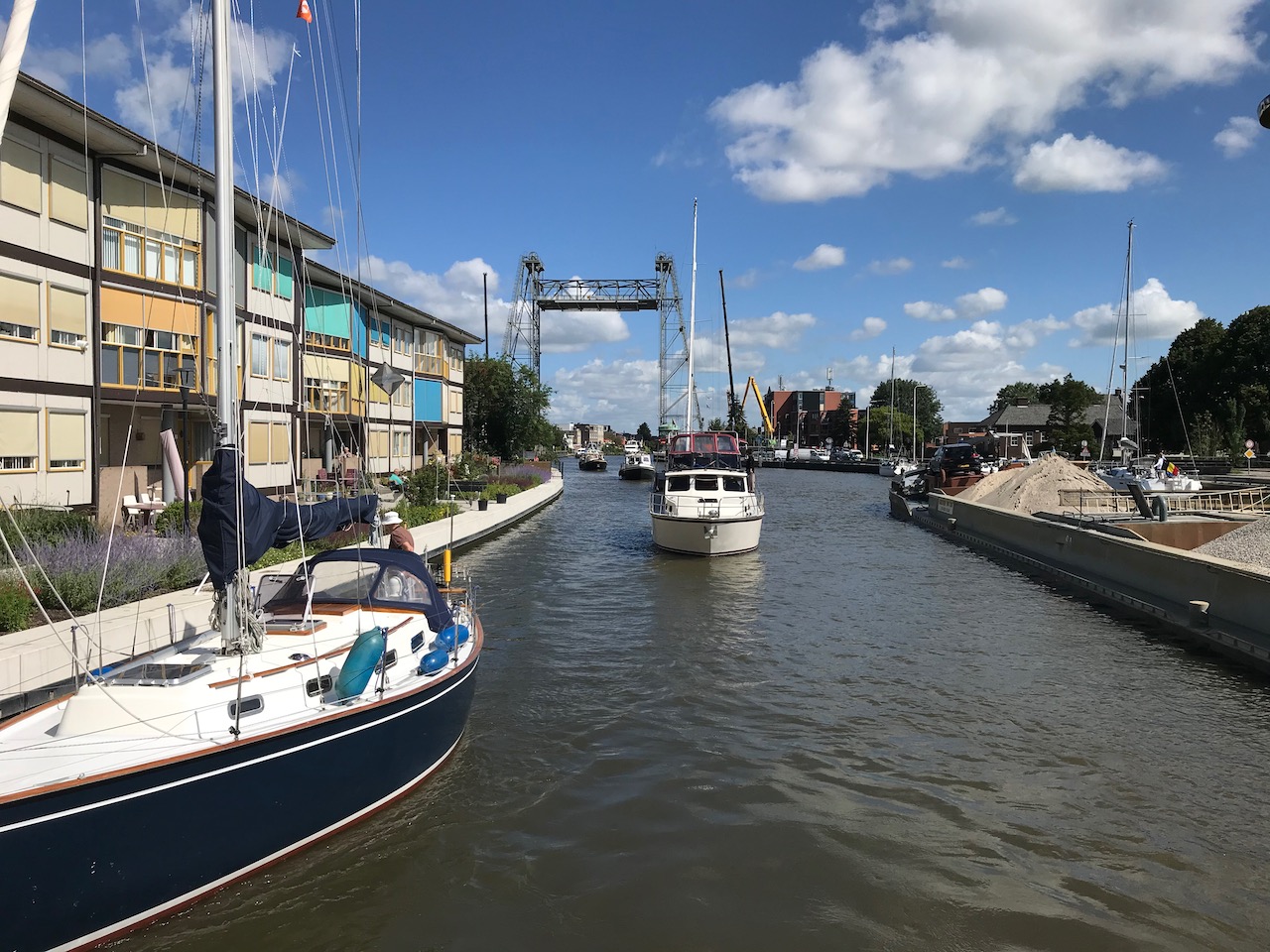 Um 10:15 nähern wir uns der Brücke. Unsere Begleitschiffe dürfen nun als Beroepsvaart bis vor die Brücke durchfahren, wir arbeiten uns langsam Richtung Brücke vor. Viele haben schon hunderte Meter vorher am Ufer festgemacht, es ist unglaublich viel los. Kein Wunder, hier hat sich ja schon zwei Tage lang der Verkehr gestaut. Um 10:45 gibt es dann von der auf einem Schlauchboot begleitenden Aufsicht das Startsignal und es folgt der allgemeine Aufbruch.