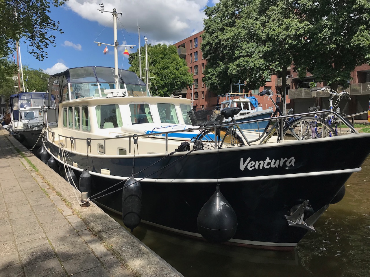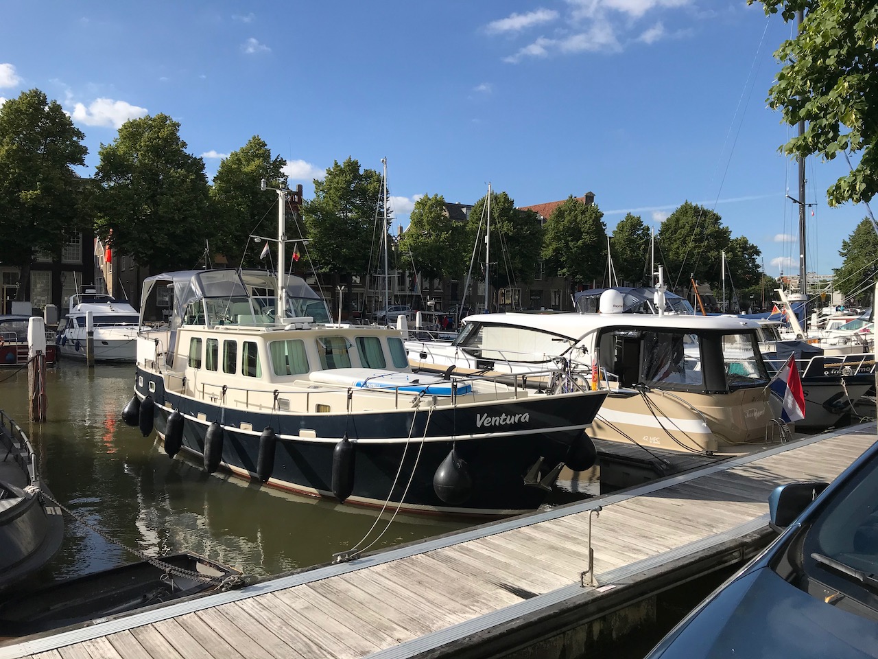 Vor Dordrecht sind wir wieder im Bereich der Verkehrskontrolle „Sector Dordt“ und vor der Kreuzung Noord/Merwede/Oude Maas spricht uns die Verkehrskontrolle an: „Ventura, was ist Ihr Ziel?“ Ich antworte: „Wir biegen rechts ab in die Oude Maas und dann zum Nieuwe Haven“. Antwort ganz ruhig „Ok, dann fahren Sie bitte etwas mehr nach steuerbord“. In dem Moment sehe ich im Rückspiegel, dass links hinter uns die Medusa fährt, ein Frachter, den wir in der Konzentration auf die Kreuzung vor uns bisher nicht bemerkt hatten. War kein Problem, wir wollten ja beide rechts abbiegen, aber mit etwas mehr Abstand geht das natürlich sicherer. Wieder mal ein Zeichen, dass AIS-Sender an. Bord doch sehr nützlich ist, denn nur so kann die Verkehrskontrolle einen direkt ansprechen. um 13:15 sind wir an der Einfahrt zum Hafen, so dass wir mit der ersten Brückenöffnung um 13:30 in den Hafen kommen.