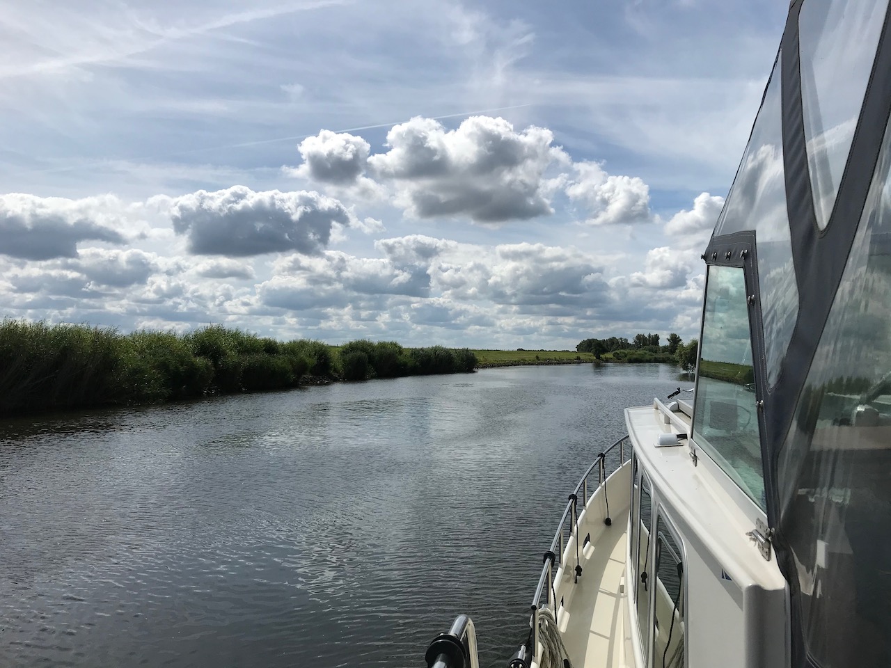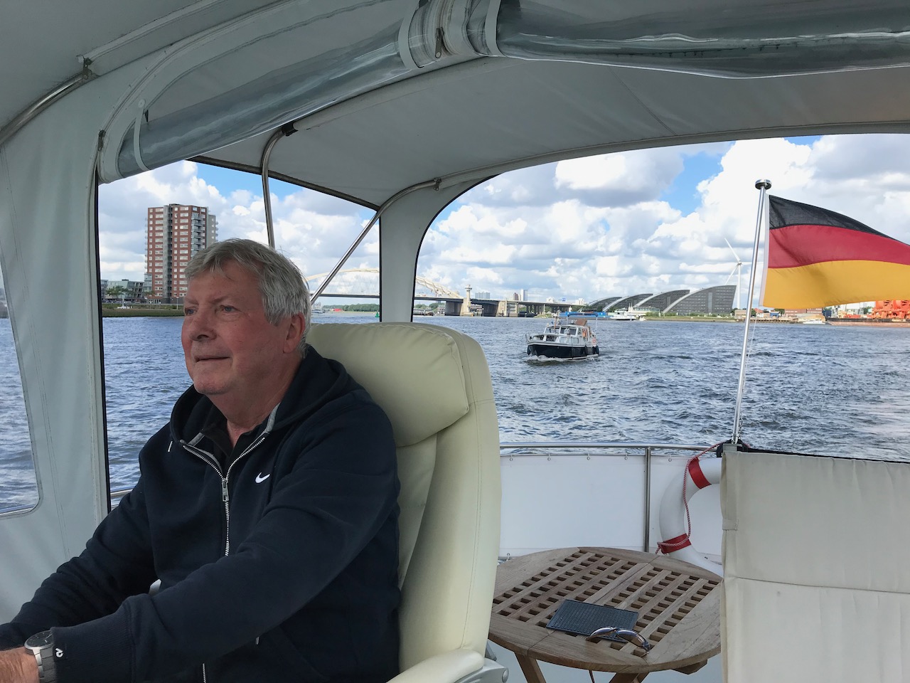 Um 9:10 legen wir in Venlo ab, bei wenig Wind, Sonne mit Wolken und 19 Grad. Heute haben wir eine entspannte Strecke von nur 25 Kilometern ohne Schleusen. Um 11:30 biegen wir von der Maas in die Einfahrt zum Leukermeer ab und fahren durch die Brücke in den Hafen ‚t Leuken ein.