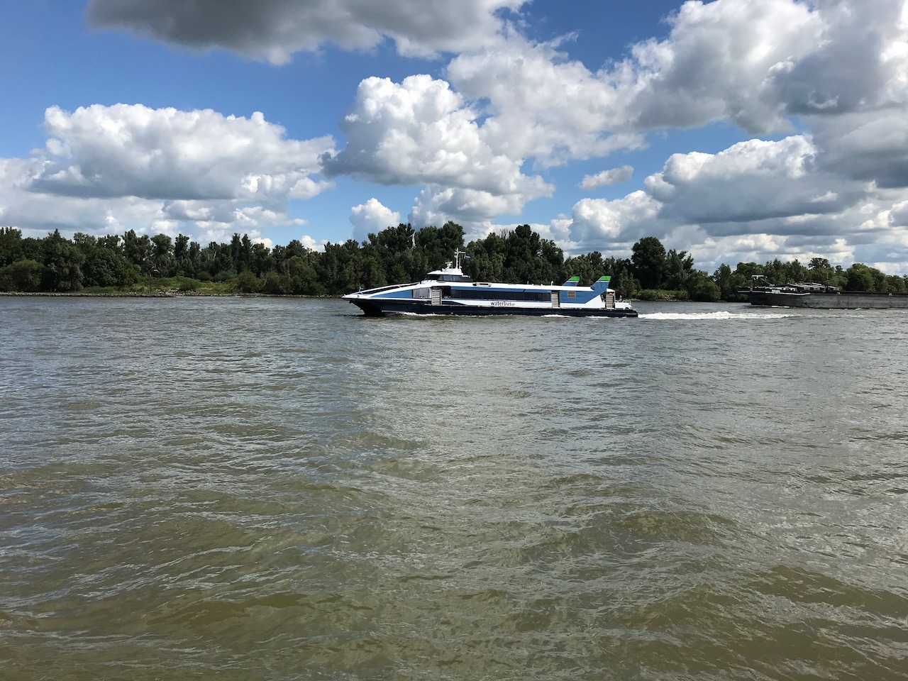 Die Strecke maasabwärts kennen wir ja schon seit acht Jahren mit unseren Booten, die bietet also nichts Neues, ist aber zum entspannten Start in den Urlaub immer schön. Bei den seilgebundenen Fähren, die den Fluss kreuzen, muss man natürlich aufpassen, denn die haben immer Vorfahrt und warten nur auf Berufsschiffe, nicht auf Freizeitboote.